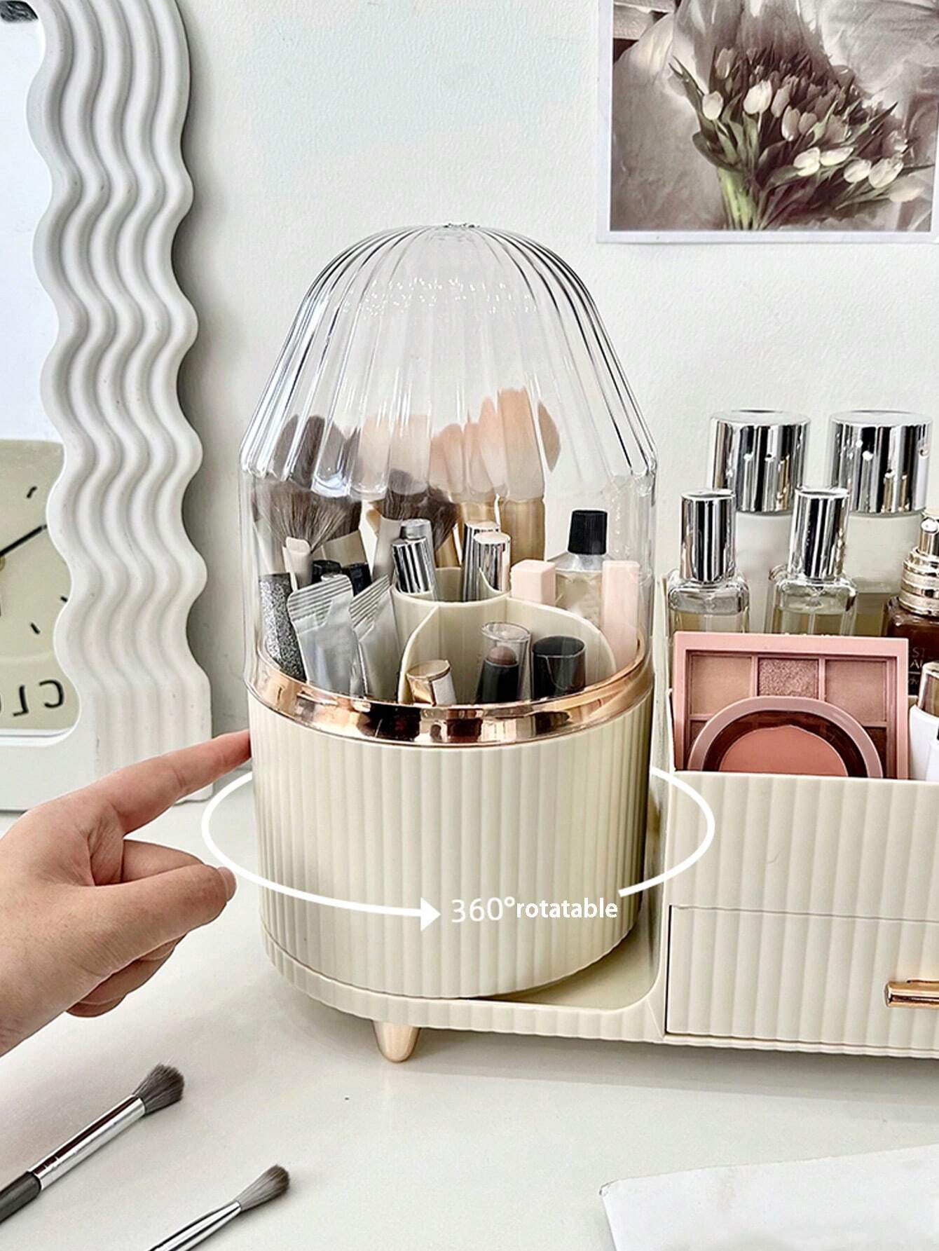 - 360° rotating brush organizer: our 360° rotating beauty organizer is divided into two areas, one half rotates and the other half divides. The 360° rotation is easy to take at any time, and the division design prevents cosmetics from being mixed together.