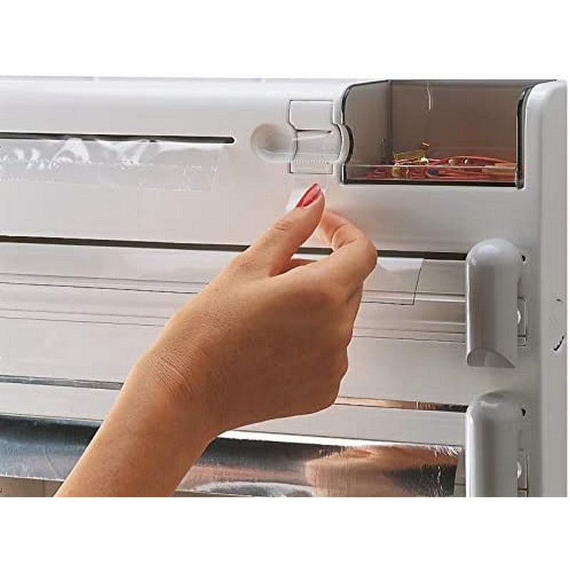 - The wall-mounted roll holder works well as a film dispenser, foil dispenser and paper roll holder, with additional storage for freezer bags and small items.