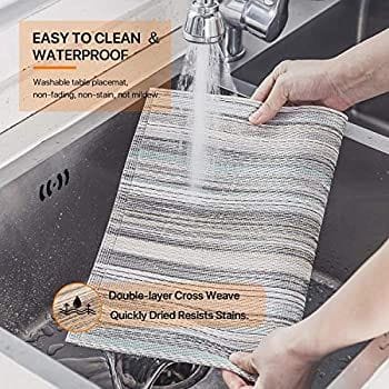 - 【Easy Cleaning】You can quickly clean your placemats after meals, saving your time.Place mats indoor set of 4, simply rinse with water or wipe with a damp cloth and dry in the shade. If the table mats is stained, you can scrub it with a soft brush. Note: Do not scrub the washable placemats with hard objects.