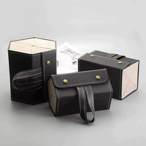 Our unique sunglasses case is the best place to store your glasses, It has multiple slots and a loop on top for a stylish display in any room. It also makes a great travel sunglasses case for a pair of glasses as it rolls up into a pentagonal box.