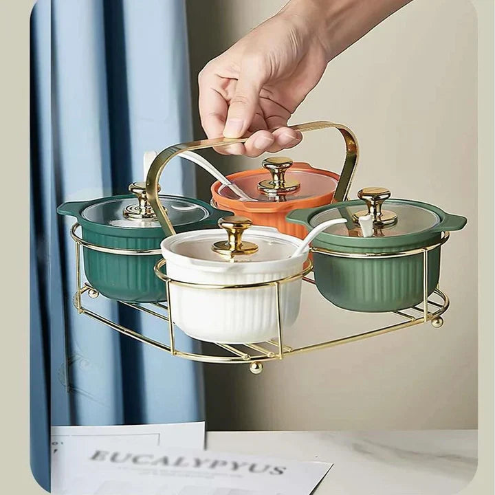 This condiment support is made of 100% stainless steel and comes with 4 bottles of seasonings. Keep your seasonings fresh on the table with this quality seasoning dispenser. This tray to serve seasonings with spicy jar (x4) can be used for a variety of uses. Small condiment bowls can be used as a masala box, multi-spicy container, condiment server set, garnish tray or Asian seasonings for your table. It can save you space in your kitchen and have seasonings within ready-to-use reach in each meal. You can make your dining table look tidy and generous. It is a classic and timeless design of Asian dishes. It is commonly used as a tray of sauce for Thai food products. This set of seasonings can be used for all seasonings, but looks great in an Asian food environment.